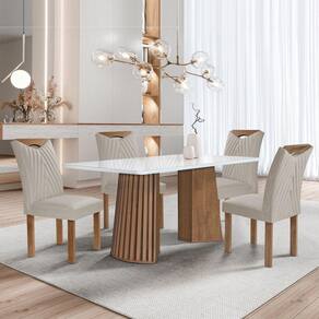 Renove sua sala de jantar com o conjunto Mesa Stella, acompanhado por quatro cadeiras. A mesa tem um visual moderno, com linhas suaves e elegantes. As cadeiras são confortáveis e têm um estilo sofisticado. Juntos, eles fazem da sua sala de jantar um lugar especial para reunir a família e os amigos. Medida da Mesa (A x L x P): 79cmx120cmx90cm Peso da Mesa: 56,4 kg Mesa suporta até: 40.0000 Acabamento da Cadeira/Banco: Pintura Acabamento da Mesa: Pintura UV Acompanha Manual de Instalação: Sim Almofada do assento: Fixa Ambiente Principal: Sala de Jantar Cadeira/Banco estofada: Encosto e Assento Estofados Cadeira/Banco Estofada: Encosto e Assento Estofados Cadeira/Banco suporta até: 120.0000 codigo_ean: 7909903599235 Complexidade da Montagem: Alta: deve ser montado por um montador especializado Cor: Chocolate/Off White/Veludo Bege Claro Cor do Produto: Chocolate/Off White/Veludo Bege Claro De Canto (Canto Alemão): Não Design da Base: Cilindro Enchimento do Assento: Espuma D-23 Enchimento do Encosto: Espuma D-20 Escala de Brilho: Fosco Espessura do Tampo: 29 mm Estrutura do Assento: MDF Estrutura do Encosto: MDF Formato do Tampo: Retangular Itens Inclusos: 1 Mesa Stella com 4 cadeiras e manual de montagem Linha ou Coleção: Stella Manual de Montagem e Instalação: https://product-hub-prd.madeiramadeira.com.br/895907/documents/6dea87e3-eeab-4983-822b-143dac67f1bbA20NEVADA20CADEIRA20NEVADA.pdf Material da Base da Mesa: MDF Material da Estrutura da Cadeira: MDF Material do Tampo: Vidro/MDF Material Principal: MDF Material Principal das Cadeiras/Bancos: MDF Medida da Cadeira/Banco (A x L x P): 96,5cmx56cmx44cm Medida do Tampo (L x C x E): 120cmx90cmx2,9cm Mesa Dobrável: Não Mesa Extensível: Não Necessita Montagem: Sim Origem do Produto: Nacional Peso da Cadeira/Banco: 9,1 kg Possui Apoio para Braços: Não Possui Apoio Para os Pés: Não Possui Prateleiras: Não Possui Suporte Giratório: Não Possui Vidro: Sim Quantidade de Cadeiras: 4 Quantidade de Lugares: 04 Recomendações de Uso, Manutenção e Limpeza: Limpar apenas com pano úmido. Revestimento da Cadeira/Banco: Veludo Sistema de Montagem: Parafusos Tipo de Assento: Fixo Tipo de Encosto: Fixo