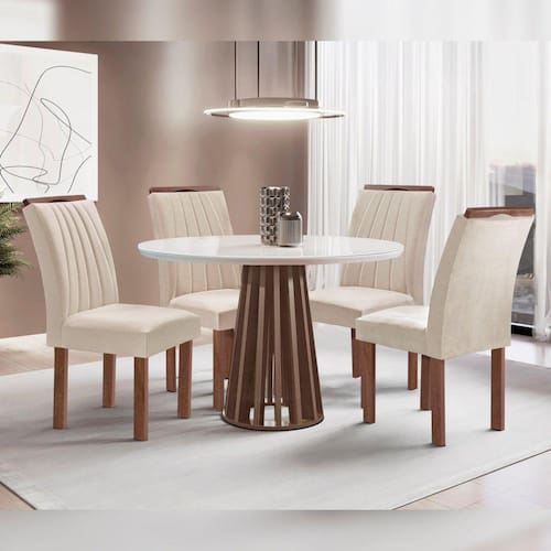 O modelo mesa Kansas e 4 cadeiras Arizona une o estilo com a funcionalidade. O conjunto é uma escolha perfeita para quem valoriza a beleza, o conforto e a qualidade duradoura em seu ambiente de jantar. Desfrute de momentos especiais com amigos e familiares em torno dessa mesa deslumbrante. Medida da Mesa (A x L x P): 79cmx100cmx100cm Peso da Mesa: 38 kg Mesa suporta até: 30.0000 Acabamento da Cadeira/Banco: Pintura Acabamento da Mesa: Pintura UV Almofada do assento: Fixa Ambiente Principal: Sala de Jantar Apoio para Braços Estofado: Não Cadeira/Banco estofada: Encosto e Assento Estofados Cadeira/Banco suporta até: 120.0000 codigo_ean: 7909903351154 Complexidade da Montagem: Média: pode ser montado por mais de uma pessoa e/ou necessite de maior conhecimento para montagem Cor: Chocolate/Off White/Suede Bege Cor do Produto: Chocolate/Off White/Suede Bege De Canto (Canto Alemão): Não Enchimento do Assento: Espuma D-23 Enchimento do Encosto: Espuma D-20 Escala de Brilho: Fosco Espessura do Tampo: 29 mm Estrutura do Assento: MDF Formato do Tampo: Redondo Itens Inclusos: 1 Mesa, 4 Cadeiras, kit ferragens e manual de montagem Linha ou Coleção: Kansas/Arizona Manual de Montagem e Instalação: https://product-hub-prd.madeiramadeira.com.br/855112/documents/bf4ff44d-7ddd-41fe-9066-d5e7cd5f37f4montagembaseberlimcaddubai.pdf Manutenção: Limpeza com pano macio e levemente umedecido. Não utilizar solventes a base e de inflamáveis. Não utilizar produtos abrasivos. Material da Base da Mesa: MDF Material da Estrutura da Cadeira: MDF Material do Tampo: Vidro/MDF Medida da Base (A x L x P): 77cmx47cmx47cm Medida da Cadeira/Banco (A x L x P): 97,5cmx44cmx58cm Medida do Tampo (L x C x E): 100cmx100cmx29mm Mesa Extensível: Não Necessita Montagem: Sim Origem do Produto: Nacional Peso da Cadeira/Banco: 9 kg Possui Apoio para Braços: Não Possui Apoio Para os Pés: Não Possui Suporte Giratório: Não Quantidade de Cadeiras: 4 Quantidade de Lugares: 04 Recomendações de Uso, Manutenção e Limpeza: Limpeza com pano macio e levemente umedecido. Não utilizar solventes a base e de inflamáveis. Não utilizar produtos abrasivos. Revestimento da Cadeira/Banco: Suede Sistema de Montagem: Parafusos Vidro Temperado: Sim