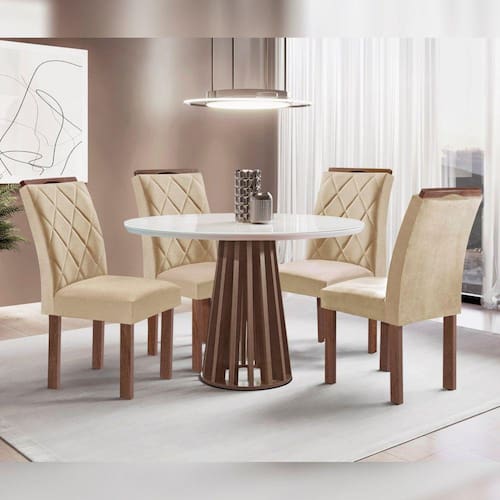 Feita em MDF de alta qualidade e com design moderno para deixar suas refeições mais especiais e únicas, o conjunto mesa Kansas e 4 cadeiras Arthuis foi projetado pensando em versatilidade e beleza para a sua sala de jantar. Medida da Mesa (A x L x P): 79cmx100cmx100cm Peso da Mesa: 38 kg Mesa suporta até: 30.0000 Acabamento da Cadeira/Banco: Pintura Acabamento da Mesa: Pintura UV Almofada do assento: Fixa Ambiente Principal: Sala de Jantar Apoio para Braços Estofado: Não Cadeira/Banco estofada: Encosto e Assento Estofados Cadeira/Banco suporta até: 120.0000 codigo_ean: 7909903351239 Complexidade da Montagem: Média: pode ser montado por mais de uma pessoa e/ou necessite de maior conhecimento para montagem Cor: Chocolate/Off White/Suede Cru Cor do Produto: Chocolate/Off White/Suede Cru De Canto (Canto Alemão): Não Enchimento do Assento: Espuma D-23 Enchimento do Encosto: Espuma D-20 Escala de Brilho: Fosco Espessura do Tampo: 29 mm Estrutura do Assento: MDF Formato do Tampo: Redondo Itens Inclusos: 1 Mesa, 4 Cadeiras, kit ferragens e manual de montagem Linha ou Coleção: Kansas/Arthus Manual de Montagem e Instalação: https://product-hub-prd.madeiramadeira.com.br/855120/documents/e6470c3c-29dc-4374-8976-6182d32d05f4ntagembaseberlimcadtoronto.pdf Manutenção: Limpeza com pano macio e levemente umedecido. Não utilizar solventes a base e de inflamáveis. Não utilizar produtos abrasivos. Material da Base da Mesa: MDF Material da Estrutura da Cadeira: MDF Material do Tampo: Vidro/MDF Medida da Base (A x L x P): 77cmx47cmx47cm Medida da Cadeira/Banco (A x L x P): 97,5cmx44cmx58cm Medida do Tampo (L x C x E): 100cmx100cmx29mm Mesa Extensível: Não Necessita Montagem: Sim Origem do Produto: Nacional Peso da Cadeira/Banco: 9 kg Possui Apoio para Braços: Não Possui Apoio Para os Pés: Não Possui Suporte Giratório: Não Quantidade de Cadeiras: 4 Quantidade de Lugares: 04 Recomendações de Uso, Manutenção e Limpeza: Limpeza com pano macio e levemente umedecido. Não utilizar solventes a base e de inflamáveis. Não utilizar produtos abrasivos. Revestimento da Cadeira/Banco: Suede Sistema de Montagem: Parafusos Vidro Temperado: Sim