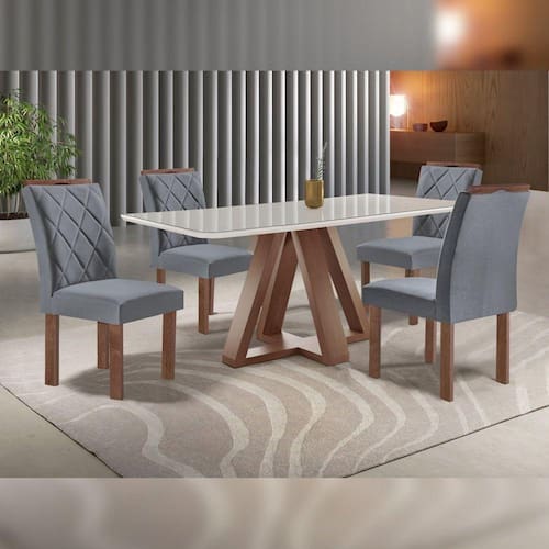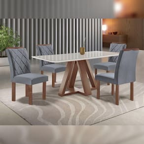 Esta é a sala de jantar perfeita para tornar suas refeições em lembranças inesquecíveis. A mesa Kyra é feita em MDF, proporcionando durabilidade e estabilidade. Sua superfície ampla e resistente oferece espaço suficiente para acomodar confortavelmente sua família e convidados. As cadeiras Arthus são estofadas, confortáveis e resistentes. Sua casa merece esse conjunto incrível. Medida da Mesa (A x L x P): 79cmx120cmx90cm Peso da Mesa: 55 kg Mesa suporta até: 30.0000 Acabamento da Cadeira/Banco: Pintura Acabamento da Mesa: Pintura UV Almofada do assento: Fixa Ambiente Principal: Sala de Jantar Apoio para Braços Estofado: Não Cadeira/Banco estofada: Encosto e Assento Estofados Cadeira/Banco suporta até: 120.0000 codigo_ean: 7909903350867 Complexidade da Montagem: Média: pode ser montado por mais de uma pessoa e/ou necessite de maior conhecimento para montagem Cor: Chocolate/Off White/Suede Cinza Cor do Produto: Chocolate/Off White/Suede Cinza De Canto (Canto Alemão): Não Enchimento do Assento: Espuma D-23 Enchimento do Encosto: Espuma D-20 Escala de Brilho: Fosco Espessura do Tampo: 29 mm Estrutura do Assento: MDF Formato do Tampo: Retangular Itens Inclusos: 1 Mesa, 4 Cadeiras, kit ferragens e manual de montagem Linha ou Coleção: Kyra/Arthus Manual de Montagem e Instalação: https://product-hub-prd.madeiramadeira.com.br/855039/documents/0f72b1f1-98d0-4829-96a9-0b5d03a1fe5a1387505manualdemontagem.pdf Manutenção: Limpeza com pano macio e levemente umedecido. Não utilizar solventes a base e de inflamáveis. Não utilizar produtos abrasivos. Material da Base da Mesa: MDF Material da Estrutura da Cadeira: MDF Material do Tampo: Vidro/MDF Medida da Base (A x L x P): 77cmx94cmx67cm Medida da Cadeira/Banco (A x L x P): 97,5cmx44cmx58cm Medida do Tampo (L x C x E): 120cmx90cmx29mm Mesa Extensível: Não Necessita Montagem: Sim Origem do Produto: Nacional Peso da Cadeira/Banco: 9 kg Possui Apoio para Braços: Não Possui Apoio Para os Pés: Não Possui Suporte Giratório: Não Quantidade de Cadeiras: 4 Quantidade de Lugares: 04 Recomendações de Uso, Manutenção e Limpeza: Limpeza com pano macio e levemente umedecido. Não utilizar solventes a base e de inflamáveis. Não utilizar produtos abrasivos. Revestimento da Cadeira/Banco: Suede Sistema de Montagem: Parafusos Vidro Temperado: Sim