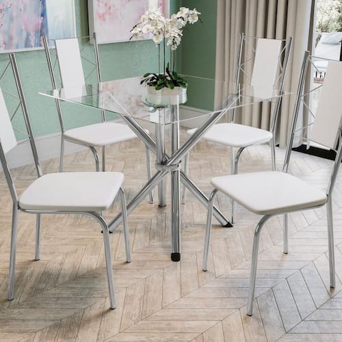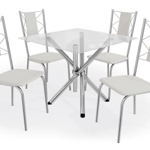 Para ambientes modernos, o conjunto CMC683 da Kappesberg é a melhor opção. Em estrutura metálica cromada, a mesa possui um design único, com destaque para a disposição dos pés, unidos por um anel central. Medindo 75cm de altura e 73cm de largura e profundidade, combinada ao tampo de vidro quadrado e transparente TAV9061, com 6mm de espessura, ela acomoda até quatro pessoas. Já as cadeiras, no modelo Lisboa, também em estrutura metálica cromada, medindo 99cm de altura, sendo 46cm a altura do assento, suportam até 130kg, garantindo estabilidade e segurança. E para mais comodidade, o assento é estofado e recoberto com sintético na cor branca. Já o encosto, com detalhe central estofado, possui acabamento reto e detalhes em aramado, proporcionando um diferencial único.