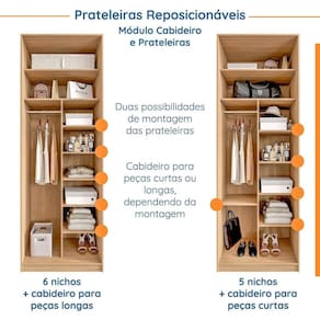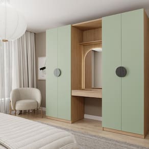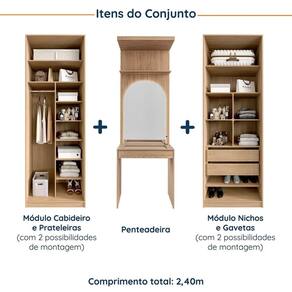 Conjunto Modulado 3 Peças Nichos com 2 Gavetas, Penteadeira e Cabideiro Joy CabeCasa MadeiraMadeira Verde. O guarda roupas Joy CabeCasa foi desenvolvido para trazer a experiência de ter seu guarda roupas planejado por uma personal organizer. O móvel possui prateleiras reguláveis e removíveis que se adaptam a diversas necessidades. Conta também com um kit que pode conter gabaritos de dobra para roupas, separadores de cabides e adesivos para identificar todos os espaços. Pensado para quem precisa de um espaço só seu o módulo de Penteadeira possui espaços para organizar perfumes, maquiagens e acessórios, o móvel conta com espelho iluminado a LED e tampo em vidro temperado, para facilitar a organização dos seus acessórios dentro da gaveta sem a necessidade de abri-la. Além disso, tem design atual e alinhado as suas tendências que irão trazer muito mais sofisticação e aconchego para a decoração.