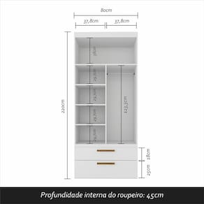 Detalhes Técnicos: Medidas do Produto Montado: A:220cm x L:160cm x P:47cm Medida do Módulo 2pts 2gav:A:220cm x L:80cm x P:47cm Medida do Módulo 2pts: A:220cm x L:80cm x P:47cm Medida da Escrivaninha: A:74cm x L:80cm x P:47cm Medida da Cômoda: A: 100cm x L:62,4cm x P:45cm MDP 12/15/25mm Acabamento: Pintura UV Tonalidade: Branco/Freijó Puxadores: MDF 18mm Cabideiro interno: Alumínio Gaveta: corrediça metálica Prateleiras suporta até 5kg distribuído Gavetas suporta até 3kg distribuído