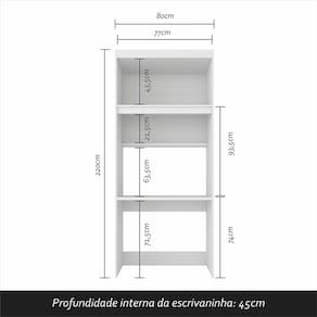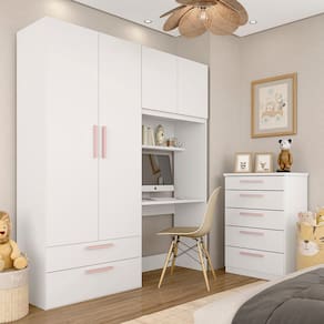 Detalhes Técnicos: Medidas do Produto Montado: A:220cm x L:160cm x P:47cm Medida do Módulo 2pts 2gav:A:220cm x L:80cm x P:47cm Medida do Módulo 2pts: A:220cm x L:80cm x P:47cm Medida da Escrivaninha: A:74cm x L:80cm x P:47cm Medida da Cômoda: A: 100cm x L:62,4cm x P:45cm MDP 12/15/25mm Acabamento: Pintura UV Tonalidade: Branco/Rosa Puxadores: MDF 18mm Cabideiro interno: Alumínio Gaveta: corrediça metálica Prateleiras suporta até 5kg distribuído Gavetas suporta até 3kg distribuído