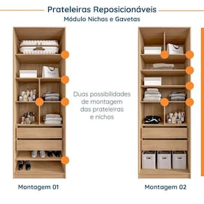 O guarda roupas Joy CabeCasa foi desenvolvido para trazer a experiência de ter seu guarda roupas planejado por uma personal organizer. O móvel possui prateleiras reguláveis e removíveis que se adaptam a diversas necessidades. Conta também com um kit que pode conter gabaritos de dobra para roupas, separadores de cabides e adesivos para identificar todos os espaços. Possui um módulo de sapateira ideal para quem precisa de espaço para guardar seus calçados e ainda pendurar acessórios, além de um nicho que confere mais versatilidade e organização ao espaço, possui montagem flex, podendo ser montado tanto para direita quanto para esquerda. Além disso, tem design atual e alinhado às suas tendências que irão trazer muito mais sofisticação e aconchego para a decoração. Acabamento da Prateleira: Finish Foil Escala de Brilho da Prateleira: Semi-Brilho Possui Cabideiros: Não Acabamento da Gaveta: Finish Foil Escala de Brilho da Gaveta: Semi-Brilho Possui Organizador de Gaveta: Não Acabamento da Porta: Finish Foil Escala de Brilho da Porta: Semi-Brilho Material do Puxador da Porta: Madeira Maciça Ambiente Principal: Quarto codigo_ean: 7909903476048 Complexidade da Montagem: Alta: deve ser montado por um montador especializado Cor: Verde Cor do Produto: Verde Escala de Brilho: Semi-Brilho Gaveta com Chave: Não Itens Inclusos: 1 Roupeiro Nichos com Gavetas, 1 Sapateira, Manual de Montagem e Kit Ferragens Linha ou Coleção: Joy Manual de Montagem e Instalação: https://product-hub-prd.madeiramadeira.com.br/878013/documents/80e298ea-fdc3-4898-87f3-15ce60c907266206joy09amanualdeinstrues.pdf Material da Gaveta: MDP Material da Porta: MDP Material da Prateleira: MDP Material Principal: MDP modular: Sim Necessita Montagem: Sim O Módulo Pode ser utilizado individualmente: Sim Origem do Produto: Nacional Peso: 170,7 kg Peso Máximo por Gaveta: 8 kg Peso Máximo por Prateleira: 12 kg Possui Calceiros: Não Possui Espelho: Não Possui Ganchos: Sim Possui iluminação: Não Possui Pés: Não Possui Portas: Sim Possui Prateleiras: Sim Produto Montado: Sim Quantidade de Gavetas: 02 Gavetas Recomendações de Uso, Manutenção e Limpeza: Retire o pó com flanela seca. Sistema de Montagem: Parafuso e Cavilha Tipo de Corrediça da Gaveta: Metálica Telescópica Tipo de Dobradiça/Corrediça da Porta: Metálica Tipo de Gaveta: Interna Tipo de Guarda-Roupa: Modulado Tipo de Puxador da Gaveta: Não Possui Tipo de Puxador da Porta: Externo Ean: 7909903476048