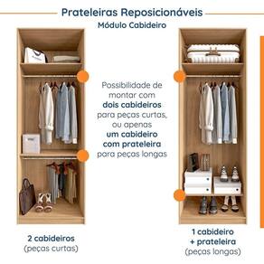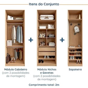 Conjunto Modulado Joy 3 Peças Cabideiros, Nicho com 2 Gavetas e Sapateira Cabecasa Madeiramadeira Verde. O guarda roupas Joy CabeCasa foi desenvolvido para trazer a experiência de ter seu guarda roupas planejado por uma personal organizer. O móvel possui prateleiras reguláveis e removíveis que se adaptam a diversas necessidades. Conta também com um kit que pode conter gabaritos de dobra para roupas, separadores de cabides e adesivos para identificar todos os espaços. Possui um módulo de sapateira ideal para quem precisa de espaço para guardar seus calçados e ainda pendurar acessórios, além de um nicho que confere mais versatilidade e organização ao espaço, possui montagem flex, podendo ser montado tanto para direita quanto para esquerda. Além disso, tem design atual e alinhado às suas tendências que irão trazer muito mais sofisticação e aconchego para a decoração.