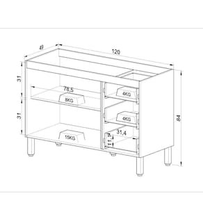 As dimensões estão expressas na seguinte forma - Largura x Altura e Profundidade em cm. O peso suportado considera a carga distribuída igualmente pela peça.