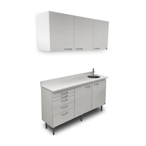 Composição Bancada contendo 5 gavetas + 2 (dois) módulos com armário + pia com torneira Armário Suspenso com 3 (três) módulos com prateleira 1 (uma) Bandeja Organizadora