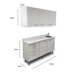 Dimensões do conjunto Armario Superior (suspenso) - Altura 58cm, Profundidade: 37cm, Largura: 1.46cm Bancada - Altura: 82cm, Profundidade 37cm, Largura 1.46cm