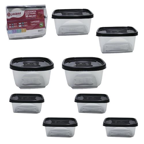 Características do Produto Conjunto de Potes contendo 10 peças da Jaguar, muito prático para guardar seus alimentos com estilo e classe mantendo a beleza da sua cozinha. Pode ser utilizado em freezer e micro-ondas. Seu dia a dia mais prático Todos transparente, com a tampa vermelha. Conteúdo: 1- Pote Redondo 740 ml 1- Pote Quadrado 690 ml 4- Potes Retangular 750 ml 4- Potes Retangular 220 ml Medida da embalagem: Comprimento: 25cm Largura: 15cm Altura: 18cm