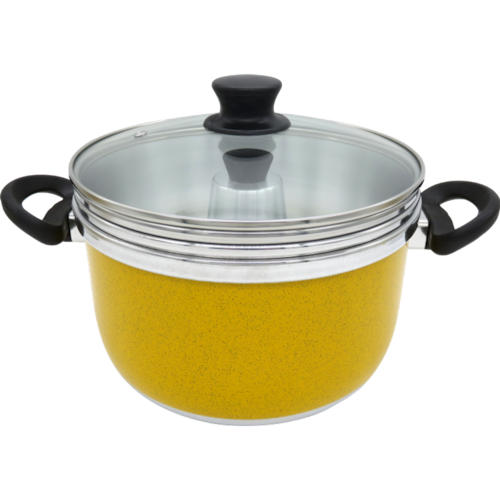 Conjunto Multiuso Amarelo 3 Peças com Tampa de Vidro 4,5 Litros Conjunto Multiuso 3x1: Panela, forma de pudim Banho Maria e forma de cozimento a vapor. Conjunto fabricado com alto padrão de qualidade em alumínio, indispensável para a preparação de legumes, pudim e outras receitas. Uma excelente opção para sua cozinha, ótimo acabamento, ideal para fazer delícias. Embalagem: 01x Panela Com Tampa De Vidro Temperado. 01x Forma De Pudim / Bolo. 01x Escorredor / Cozimento a Vapor.