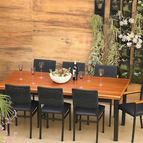 O Conjunto de Jantar Náutico para área gourmet externa combina design sofisticado e praticidade, ideal para reunir família e amigos em momentos memoráveis. A mesa retangular com tampo em madeira clara contrasta harmoniosamente com a estrutura metálica preta, oferecendo resistência e durabilidade mesmo em ambientes externos.