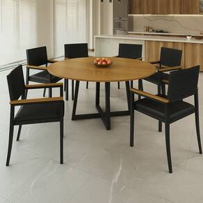 Faz parte do anúncio: 1 Mesa Laminada 1,50m Solara 6 Cadeiras Metálicos com Braço Solara Obs.: Não acompanha objetos decorativos. Indicado para uso em áreas internas e semi-abertos, LIVRES DE CHUVA