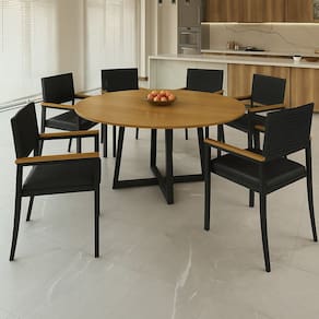Faz parte do anúncio: 1 Mesa Laminada 1,50m Solara 6 Cadeiras Metálicos com Braço Solara Obs.: Não acompanha objetos decorativos. Indicado para uso em áreas internas e semi-abertos, LIVRES DE CHUVA