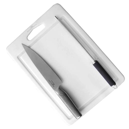 Cores: Única Dimensões:36cm x 25cm x 85mm (tábua) / 32cm (faca e amolador) Material: Tábua de poliamida, faca e amolador de aço inoxidável com pegadores anti-derrapantes Peso (gramas):950n