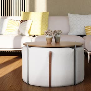 O conjunto acompanha 01 mesa A47 x Ø82,5 e 04 Puffs A42 x L56 x P35.