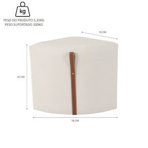 Esse conjunto é a opção perfeita para o seu ambiente, a mesa possui estrutura em metal com pintura epoxi na cor níquel e seu tampo em MDF em lamina de cinamomo na cor amêndoa, os puffs estofados com assento densidade 23 com tecido na cor palha, 52% de algodão e 48% poliéster, com detalhe em cinto caramelo e um pingente em brilhante.