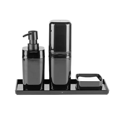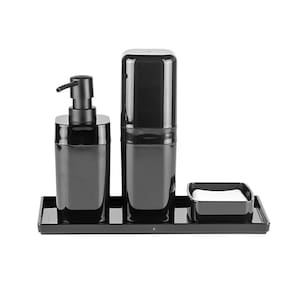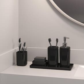 Conjunto Organizador para Banheiro 4 Peças Preto CozaO Conjunto Organizador para Banheiro 4 peças da Linha Splash é uma solução completa para a organização de seu banheiro, especialmente no quesito higiene pessoal. Além de facilitar sua rotina, esse kit deixa a decoração do ambiente mais bonita e ajuda a evitar desperdícios. O conjunto é formado por 01 porta-escova com tampa, 01 porta-sabonete líquido, 01 saboneteira e 01 bandeja para banheiro.