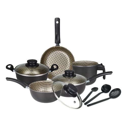 Toda cozinha parece renovada quando recebe um conjunto de panelas novo. O conjunto inclui 2 panelas com 16 e 18 cm , frigideira, fervedor e caçarola, incluiu 3 utensílios para cozinha Espátula, pegador de macarrão e colher grande .