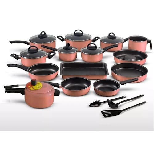 Peças incluídas no conjunto: 01 panela de pressão 04 panelas 02 caçarolas 03 frigideiras fundas 01 fervedor 03 formas 03 acessórios