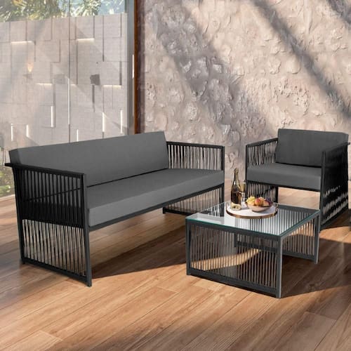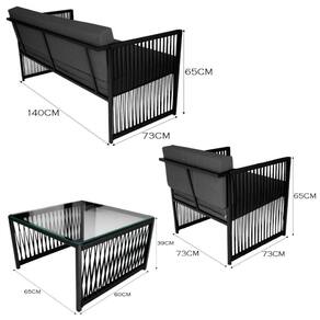 Conjunto Para área Externa De Corda Náutica Preto/cinza Que tal trazer modernidade para sua area de lazer? O Kit Santiago oferece estilo unico, deixando seu ambiente ainda mais aconchegante. Composto por 1 poltrona, namoradeira e uma mesa de centro com tampo de vidro. Suas estruturas sao fabricadas em Aco Carbono, com acabamento em Corda Nautica, proporcionando resistencia e durabilidade. Possui assentos e encostos estofados com material Impermeavel e espuma D28 o que proporciona uma sensacao de suavidade ao sentar-se. Garantindo conforto e praticidade. ESPECIFICACOES TECNICAS: - Material: Aco Carbono; - Material do Assento: Espuma D28; - Material do Encosto: Espuma D28; - Acabamento: Corda Nautica; - Impermeavel: Sim; - Possui Tampo? Sim; - Possui Vidro? Sim; - Quantidade de Poltrona: 1 Poltrona; - Quantidade de Namoradeira: 1 Namoradeira; - Produto Precisa de Montagem? (Sim/Nao): Nao; - Peso Total Suportado: 150kg; - Garantia: 3 Meses; - Instrucoes de Cuidado: Limpar com pano umedecido e sabao neutro; - Dimensoes do Produto (LarguraXProfundidadeXAltura) Mesa: 60x60cm / Poltrona: 60x73x65cm / Namoradeira: 140x73x65cm - Conteudo da Embalagem: (01 Mesa de Centro, 01 Poltronas e 01 Namoradeira). Marca: Kit Home