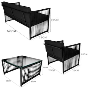 Conjunto Para área Externa De Corda Náutica Preto/preto O Conjunto Santiago oferece nao apenas um visual sofisticado, mas tambem durabilidade, resistencia e conforto, tornando-o uma escolha versatil e atraente para diferentes espacos e ambientes. Fabricado com estrutura em Aco Carbono, proporcionando resistencia e durabilidade. O acabamento em Corda Nautica confere um toque de elegancia, combinando perfeitamente com diferentes estilos de decoracao, enquanto o vidro na mesa de centro adiciona um toque moderno e funcional. Os assentos e encostos das poltronas e da namoradeira sao estofados com material Impermeavel e espuma D28 o que proporciona uma sensacao de suavidade ao sentar-se. ESPECIFICACOES TECNICAS: - Material: Aco Carbono; - Material do Assento: Espuma D28; - Material do Encosto: Espuma D28; - Acabamento: Corda Nautica; - Impermeavel: Sim; - Possui Tampo? Sim; - Possui Vidro? Sim; - Quantidade de Poltrona: 2 Poltronas; - Quantidade de Namoradeira: 1 Namoradeira; - Produto Precisa de Montagem? (Sim/Nao): Nao; - Peso Total Suportado: 150kg; - Garantia: 3 Meses; - Instrucoes de Cuidado: Limpar com pano umedecido e sabao neutro; - Dimensoes do Produto (LarguraXProfundidadeXAltura) Mesa: 60x60cm / Poltrona: 60x73x65cm / Namoradeira: 140x73x65cm - Conteudo da Embalagem: (01 Mesa de Centro, 02 Poltronas e 01 Namoradeira); Marca: ACESSE MÓVEIS