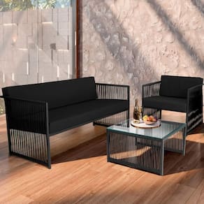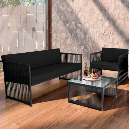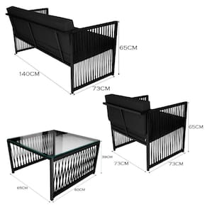 Conjunto Para área Externa De Corda Náutica Preto/preto Que tal trazer modernidade para sua area de lazer? O Kit Santiago oferece estilo unico, deixando seu ambiente ainda mais aconchegante. Composto por 1 poltrona, namoradeira e uma mesa de centro com tampo de vidro. Suas estruturas sao fabricadas em Aco Carbono, com acabamento em Corda Nautica, proporcionando resistencia e durabilidade. Possui assentos e encostos estofados com material Impermeavel e espuma D28 o que proporciona uma sensacao de suavidade ao sentar-se. Garantindo conforto e praticidade. ESPECIFICACOES TECNICAS: - Material: Aco Carbono; - Material do Assento: Espuma D28; - Material do Encosto: Espuma D28; - Acabamento: Corda Nautica; - Impermeavel: Sim; - Possui Tampo? Sim; - Possui Vidro? Sim; - Quantidade de Poltrona: 1 Poltrona; - Quantidade de Namoradeira: 1 Namoradeira; - Produto Precisa de Montagem? (Sim/Nao): Nao; - Peso Total Suportado: 150kg; - Garantia: 3 Meses; - Instrucoes de Cuidado: Limpar com pano umedecido e sabao neutro; - Dimensoes do Produto (LarguraXProfundidadeXAltura) Mesa: 60x60cm / Poltrona: 60x73x65cm / Namoradeira: 140x73x65cm - Conteudo da Embalagem: (01 Mesa de Centro, 01 Poltronas e 01 Namoradeira). Marca: ACESSE MÓVEIS