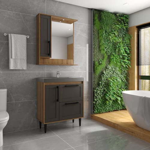 Conjunto para banheiro ozini móveis. Conjunto na cor lamina mel com portas grafite, tampo com acabamento grafite combinando com as portas. Ideal para quem busca sofisticação e elegância, sem perder a funcionalidade. Conjunto acompanha balcão com pés, espelheira com luminária e tampo com acabamento grafite. Acabamento da Cuba: Acetinado Acabamento da Gaveta: Acetinado Acabamento da Porta: Acetinado Acabamento da Prateleira: Melamínico Acabamento dos Pés: ABS Acompanha Cuba: Sim Acompanha Lâmpada: 01 Acompanha Tampo: Sim Altura dos Pés: 17 cm Ambiente Principal: Banheiro codigo_ean: 7909903904022 Complexidade da Montagem: Baixa: pode ser montado por uma pessoa sozinha Cor: Lamina Mel / Grafite Cor do Produto: Lamina Mel / Grafite Cor Interna: Lamina Mel Escala de Brilho: Semi-Brilho Escala de Brilho da Prateleira: Semi-Brilho Espessura do Espelho: 3 mm Formato do Espelho: Retangular Furação para Cuba e Torneira: Sim Gaveta com Chave: Não Itens Inclusos: 1 Balcão, 1 Espelheira, 1 Tampo, Kit Ferragens e Manual de Montagem Manual de Montagem e Instalação: https://product-hub-prd.madeiramadeira.com.br/936703/documents/977b06e2-5f0e-4bf9-94ae-eeabcb9b03612279771336517249575857841.pdf Material da Cuba: Mármore Sintético Material da Gaveta: MDP Material da Porta: MDP Material da Prateleira: MDP Material do Tampo: Mármore Sintético Material dos Pés: ABS Material Principal: MDP Medida da Cuba (C x L x P): 80x40x7cm Medida da Espelheira (A x L x P): 90x79x16,5cm Medida do Gabinete (A x L x P): 76x23x16,5cm Necessita Montagem: Sim Origem do Produto: Nacional Pés Reguláveis: Sim Peso: 48,4 kg Peso Máximo por Gaveta: 3 kg Peso Máximo por Prateleira: 3 kg Possui Espelheira: Sim Possui Gabinete: Sim Possui iluminação: Sim Possui Pés: 04 Possui Rodízio: Não Produto Montado: Sim Recomendações de Uso, Manutenção e Limpeza: Limpeza com pano úmido e não abrasivo Sapatas Niveladoras: Sim Sistema de Montagem: Parafusos, cavilhas Suporta Até (kg): 15 kg Tamanho do Espelho (A x L): 51x75cm Tipo de Corrediça da Gaveta: Metálica Telescópica Tipo de Dobradiça/Corrediça da Porta: Metálica Tipo de Porta: Bater Tipo de Puxador da Gaveta: Externo Tipo de Puxador da Porta: Externo Marca: Ozini