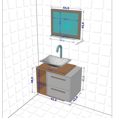 Características: MDP 15mm e 12mm, Cuba de apoio, de mármore sintético ou PRFV (Polímero Reforçado com Fibra de Vidro) 1 Porta 1 gaveta Corrediça metálicas Espelho Prateleira de vidro