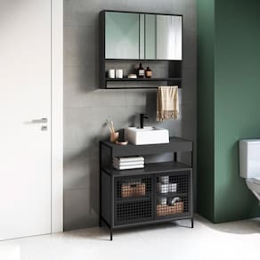 Tenha no seu banheiro ou lavabo o Conjunto de Banheiro Gabinete, Espelheira e Cuba, uma combinação perfeita de funcionalidade e estilo. O gabinete, com portas vazadas em metal, garante ventilação ideal e um toque moderno, enquanto a espelheira oferece praticidade com suas prateleiras, duas portas com espelho e um toalheiro integrado. A cuba retangular de material de mármore sintético é um ótima opção para sobrepor. Este conjunto alia a sofisticação do estilo industrial, trazendo organização dos seus objetos para o seu espaço. Ideal para armazenar itens de higiene e beleza, é a escolha certa para quem busca um design moderno. Este móvel chegará na sua casa separado em 03 volumes.