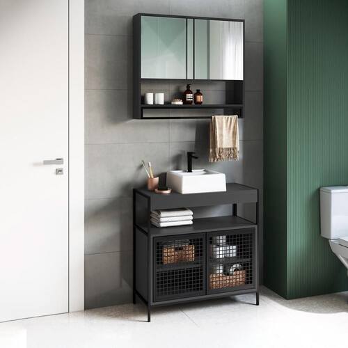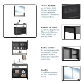 Materiais: Estrutura e portas em aço com pintura Epoxi; composição interna em MDP 15mm, 2 Portas com espelho, toalheiro em metal, nichos internos para organizar seus objetos, dobradiças metálicas, cuba de mármore sintético