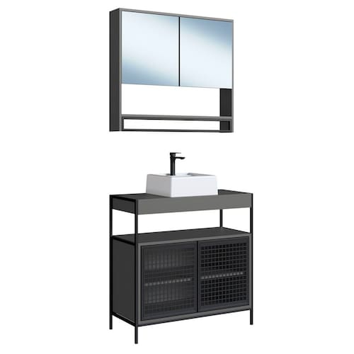 Materiais: Estrutura e portas em aço com pintura Epoxi; composição interna em MDP 15mm, 2 Portas com espelho, toalheiro em metal, nichos internos para organizar seus objetos, dobradiças metálicas, cuba de mármore sintético