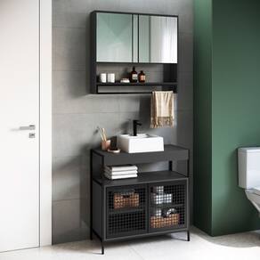 Tenha no seu banheiro ou lavabo o Conjunto de Banheiro Gabinete, Espelheira e Cuba, uma combinação perfeita de funcionalidade e estilo. O gabinete, com portas vazadas em metal, garante ventilação ideal e um toque moderno, enquanto a espelheira oferece praticidade com suas prateleiras, duas portas com espelho e um toalheiro integrado. A cuba retangular de material de mármore sintético é um ótima opção para sobrepor. Este conjunto alia a sofisticação do estilo industrial, trazendo organização dos seus objetos para o seu espaço. Ideal para armazenar itens de higiene e beleza, é a escolha certa para quem busca um design moderno. Este móvel chegará na sua casa separado em 03 volumes.