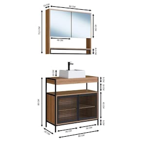 Materiais: Estrutura e portas em aço com pintura Epoxi; composição interna em MDP 15mm, 2 Portas com espelho, toalheiro em metal, nichos internos para organizar seus objetos, dobradiças metálicas, cuba de mármore sintético