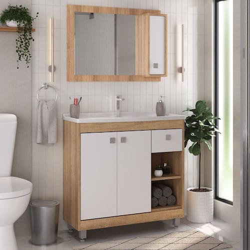 Conjunto de banheiro de 80cm com porta embutida, acompanha balcão, espelheira e tampo. Produto com caixa madeira e frente branca, possui uma gaveta e 3 prateleiras. Sapata com regulagem de altura para facilitar instalação e nivelamento. Acabamento da Cuba: Alto Brilho Acabamento da Gaveta: Melamínico Acabamento da Porta: Melamínico Acabamento da Prateleira: Melamínico Acabamento dos Pés: ABS Acompanha Cuba: Sim Acompanha Tampo: Sim Altura dos Pés: 14 cm Ambiente Principal: Banheiro Complexidade da Montagem: Baixa: pode ser montado por uma pessoa sozinha Cor: Castanho Argel/Branco Cor da Cuba: Branco Cor do Produto: Castanho Argel/Branco Cor Interna: Castanho Argel Escala de Brilho: Semi-Brilho Escala de Brilho da Gaveta: Semi-Brilho Escala de Brilho da Porta: Semi-Brilho Escala de Brilho da Prateleira: Semi-Brilho Espessura do Espelho: 3 mm Formato do Espelho: Retangular Furação para Cuba e Torneira: Sim Gaveta com Chave: Não Itens Inclusos: 1 Conjunto de Banheiro, Kit Ferragens e Manual de Montagem Linha ou Coleção: Essenza Manual de Montagem e Instalação: https://cdn2.madeiramadeira.com.br/atributo/ozini-moveis/1249039-c00825-manual.pdf Material da Cuba: Mármore Sintético Material da Gaveta: MDP Material da Porta: MDP Material da Prateleira: MDP Material do Puxador da Gaveta: PVC Material do Puxador da Porta: MDP Material do Tampo: Mármore Material dos Pés: Plástico Material Principal: MDP Medida da Cuba (C x L x P): 80x32x12 Medida da Espelheira (A x L x P): 52x72x13,5cm Medida do Gabinete (A x L x P): 80x80x32cm Necessita Montagem: Sim Origem do Produto: Nacional Pés Reguláveis: Sim Peso: 32 kg Peso Máximo por Gaveta: 5 kg Peso Máximo por Prateleira: 4 kg Possui Espelheira: Sim Possui Gabinete: Sim Possui Gavetas: 01 Possui iluminação: Não Possui Pés: 04 Possui Portas: 03 Possui Rodízio: Não Recomendações de Uso, Manutenção e Limpeza: Limpeza deve se feita com pano úmido. Não utilizar nada abrasivo.ivolimpeza com pano úmido Sapatas Niveladoras: Sim Sistema de Montagem: Parafusos Suporta Até (kg): 15 kg Tamanho do Espelho (A x L): 51x43cm Tipo de Corrediça da Gaveta: Metálica Simples Tipo de Dobradiça/Corrediça da Porta: Metálica Tipo de Porta: Bater Tipo de Puxador da Gaveta: Externo Tipo de Puxador da Porta: Externo Marca: Ozini