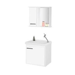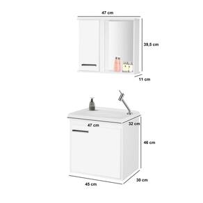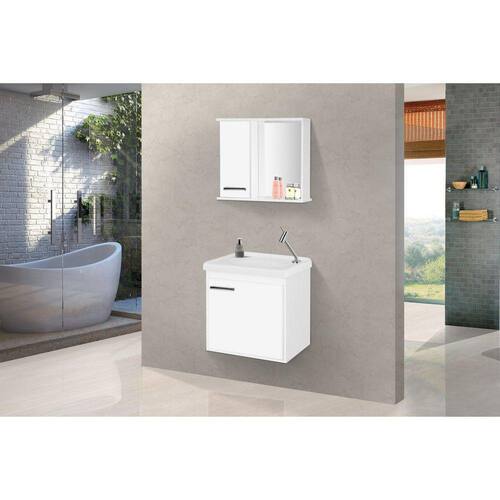 Composto por Espelheira com espelho, armário c/ porta e prateleira interna, Gabinete com porta e pia inclusa.