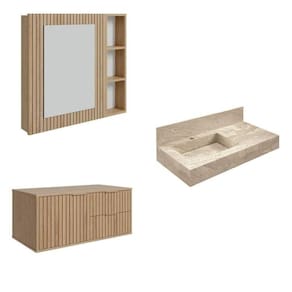 O CONJUNTO é composto por ARMÁRIO + ESPELHEIRA + BANCADA. ARMÁRIO fabricado em MDP BP (15mm), com ripas autênticas de HDF BP (06mm), na largura de 20mm. Puxadores em alumínio anodizado, gaveta com corrediças telescópicas, e porta com dobradiças slow, com sistema amortecedor. ESPELHEIRA possuí espelho de 550 X 390 X 03 mm com acabamento lapidado, estruturado em porta com ripas autênticas de HDF BP (06mm). Possui prateleiras internas, porta com dobradiças slow, com sistema de amortecedor e nicho com prateleiras ao lado, para maior organização. BANCADA com cuba esculpida, fábricada em porcelanato, com baixíssima absorção de umidade, resistente a riscos e manchas. Armário e Espelheira acompanham tapa furos + parafusos + buchas de nylon para fixação na parede. B Altura do Conjunto: 70 cm Ambiente: null Ambiente Principal: Banheiro Cor: Wood Informação Complementar: 1x Bancada em Porcelanato para Banheiro 80cm Pró com Cuba Esculpida Travertino Largura: 80 Altura: 26.4 Peso: 17.935 Profundidade: 40 Necessita Montagem: Não