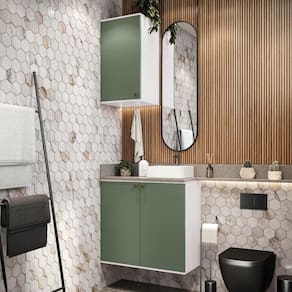 Para espaços menores e otimizados, aposte na beleza e qualidade do 100% MDF da Celeste da Kappesberg. A escolha ideal para quem possui um banheiro pequeno e não abre mão de estilo e praticidade, o combo CB1286 será o complemento ideal para ter na sua casa. Com dois módulos de aéreo, você terá o espaço necessário para armazenar toalhas, cestos e demais itens do seu dia a dia. Fácil de adaptar, com até sete camadas de pintura, a caixaria é na cor branco brilho, enquanto as frentes são na cor verde oliva, com acabamento fosco. A combinação perfeita para todos os ambientes, garantindo sofisticação, estilo e praticidade na limpeza, deixando seu banheiro completo. As portas contam com amortecimento, garantindo um fechamento suave, sem ruído e mais durabilidade, e para completar a beleza dos módulos, os puxadores, metálicos na cor dourada, transformam seu projeto com estilo. Aposte na Celeste e monte seu banheiro com toda a beleza e praticidade que a Kappesberg oferece.