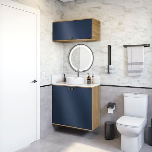 Para espaços menores e otimizados, aposte na beleza e qualidade do 100% MDF da Celeste da Kappesberg. A escolha ideal para quem possui um banheiro pequeno e não abre mão de estilo e praticidade, o combo CB1285 será o complemento ideal para ter na sua casa. Com dois módulos de aéreo, você terá o espaço necessário para armazenar toalhas, cestos e demais itens do seu dia a dia. Fácil de adaptar, com até sete camadas de pintura, a caixaria é na cor nogueira, com acabamento touch, enquanto as frentes são em azul profundo, com acabamento fosco. Uma combinação sofisticada e única, que trará conforto e elegância para todos os ambientes, deixando seu banheiro completo. As portas contam com amortecimento, garantindo um fechamento suave, sem ruído e mais durabilidade, e para completar a beleza dos módulos, os puxadores, metálicos na cor dourada, transformam seu projeto com estilo. Aposte na Celeste e monte seu banheiro com toda a beleza e praticidade que a Kappesberg oferece.