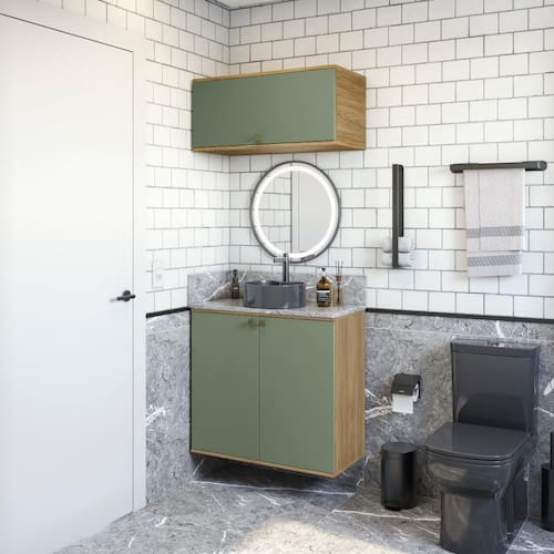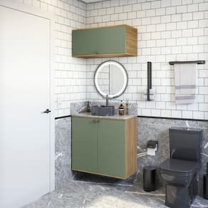 Para espaços menores e otimizados, aposte na beleza e qualidade do 100% MDF da Celeste da Kappesberg. A escolha ideal para quem possui um banheiro pequeno e não abre mão de estilo e praticidade, o combo CB1285 será o complemento ideal para ter na sua casa. Com dois módulos de aéreo, você terá o espaço necessário para armazenar toalhas, cestos e demais itens do seu dia a dia. Fácil de adaptar, com até sete camadas de pintura, a caixaria é na cor nogueira, com acabamento touch, enquanto as frentes são em verde oliva, com acabamento fosco. Uma combinação sofisticada e única, e remetendo aos tons da natureza, trará conforto e elegância, deixando seu banheiro completo. As portas contam com amortecimento, garantindo um fechamento suave, sem ruído e mais durabilidade, e para completar a beleza dos módulos, os puxadores, metálicos na cor dourada, transformam seu projeto com estilo. Aposte na Celeste e monte seu banheiro com toda a beleza e praticidade que a Kappesberg oferece.