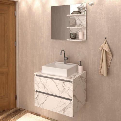 Conjunto Para Banheiro 03 Peças. Com design prático e funcional, estas peças ao ambiente toques de modernidade e elegância. Possuem estruta em MDP de 15mm, e acabamento em pintura UV/BP. Composto por 02 gavetas com corrediças metálicas, 03 prateleiras para deixar seus itens mais utilizados sempre a mão. Cuba em mármore sintético e acabamento Brilho Polido, esta Cuba já vai com furação para intalação da torneira (torneira não inclusa). O mármore sintético combina alta resistência ao impacto e baixa porosidade, proporcionando maior impermeabilidade a manchas, o que garante a resistência e vitalidade do produto. Este conjunto é uma ótima escolha para manter seus produtos de higiene e beleza sempre organizados. Estes produtos chegarão na sua casa separados em 03 volumes.