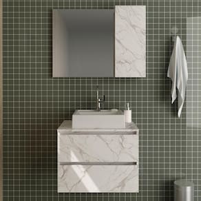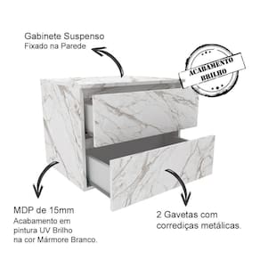 Conjunto Para Banheiro 03 Peças. Com design prático e funcional, estas peças ao ambiente toques de modernidade e elegância. Possuem estruta em MDP de 15mm, e acabamento em pintura UV/BP. Gabinete com 02 gavetas com corrediças metálicas, espelheira com 01 porta na lateral com dobradiças metálicas, 3 nichos internos para tornar mais pratica sua rotina, conta com espelho ja fixado no painel. Cuba em mármore sintético e acabamento Brilho Polido, esta Cuba já vai com furação para intalação da torneira (torneira não inclusa). O mármore sintético combina alta resistência ao impacto e baixa porosidade, proporcionando maior impermeabilidade a manchas, o que garante a resistência e vitalidade do produto. Este conjunto é uma ótima escolha para manter seus produtos de higiene e beleza sempre organizados. Estes produtos chegarão na sua casa separados em 03 volumes.