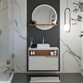 Transforme seu banheiro com o Conjunto de Banheiro Jasper. Ele conta com uma cuba, um gabinete funcional com 1 porta basculante e nicho versátil, O espelho redondo, além de refletir beleza, oferece uma prateleira engrossurada para itens essenciais. Suas bordas em PVC não apenas garantem durabilidade, mas também acrescentam um toque de acabamento. A harmonia perfeita entre forma e função para elevar o estilo e a organização do seu espaço. Acabamento da Cuba: Alto Brilho Acabamento da Porta: BP Acabamento da Prateleira: BP Acompanha Cuba: Sim Acompanha Tampo: Sim Ambiente Principal: Banheiro Complexidade da Montagem: Baixa: pode ser montado por uma pessoa sozinha Cor: Branco/ Itapuã Cor da Cuba: Branco Cor do Produto: Branco/ Itapuã Cor Flex: Não Cor Interna: Branco Escala de Brilho: Fosco Escala de Brilho da Porta: Fosco Escala de Brilho da Prateleira: Fosco Espessura do Espelho: 3 Formato do Espelho: Redondo Furação para Cuba e Torneira: Sim Informações Complementares: Acabamento com Bordas PVC 1mm Itens Inclusos: 1 Gabinete, 1 Espelho, Kit Ferragens, Montagem de Montagem Linha ou Coleção: Jasper Manual de Montagem e Instalação: https://product-hub-prd.madeiramadeira.com.br/861239/documents/cf8558c7-0aa1-4031-98c0-e2464437f3b80044001001manualdemontagem.pdf Material da Cuba: Mármore Sintético Material da Porta: MDP Material da Prateleira: MDP Material do Tampo: MDP Material Principal: MDP Medida da Cuba (C x L x P): 34x33x10 Medida da Espelheira (A x L x P): 71,6x80x12 Medida do Gabinete (A x L x P): 57x80x40 Montagem Flex: Não Necessita Montagem: Sim Origem do Produto: Nacional Peso: 44 Peso Máximo por Prateleira: 2 Possui Espelheira: Sim Possui Gabinete: Sim Possui Gavetas: Não Possui iluminação: Não Possui Pés: Suspenso Possui Portas: 01 Possui Rodízio: Não Recomendações de Uso, Manutenção e Limpeza: Utilizar pano limpo e umido Sistema de Montagem: Minifix, Parafusos e Cavilhas Suporta Até (kg): 45 Tamanho do Espelho (A x L): 63.4 Tipo de Dobradiça/Corrediça da Porta: Metálica Tipo de Gabinete: Gabinete Suspenso Tipo de Porta: Basculante Tipo de Puxador da Porta: Embutido Marca: Miroo Móveis Ean: 7909903386767