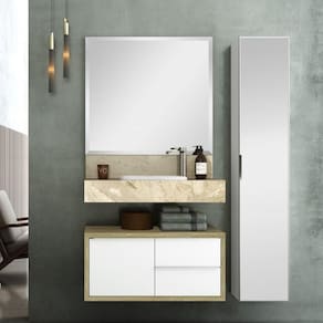 Gabinete fabricado em MDP BP (15 e 25mm), puxadores de alumínio anodizado, gavetas com corrediças telescópicas. Porta com dobradiças slow (35 mm) proporcionam fechamento suave. Espelho Cristal 03 mm com acabamento bisotê, estruturado em painel de MDF. Armário Vertical fabricado em MDP BP (15mm e 18mm), puxador de alumínio anodizado, porta com dobradiças grandes (35mm) e prateleiras com suportes de aço, porta espelhada para o corpo inteiro, espelho com película de proteção emoldurado em reforçado perfil de alumínio. Bancada para Banheiro é fabricada em porcelanato técnico polido, acompanha cuba embutida de louça, mais frontão frontal e frontão lateral. Ideal para compor com os gabinetes Pró 80 da marca Bumi Móveis * Não acompanha torneiras e acessórios. Altura do Conjunto: cm Ambiente: null Ambiente Principal: Banheiro Cor: Travertino Informação Complementar: 1x Espelho para Banheiro 80x80cm Acabamento em Bisotê Blu Espelhado Largura: 80 cm Altura: 80 cm Peso: 9,6 kg Profundidade: 1,2 cm Necessita Montagem: Não