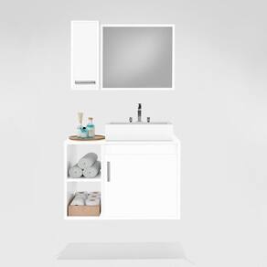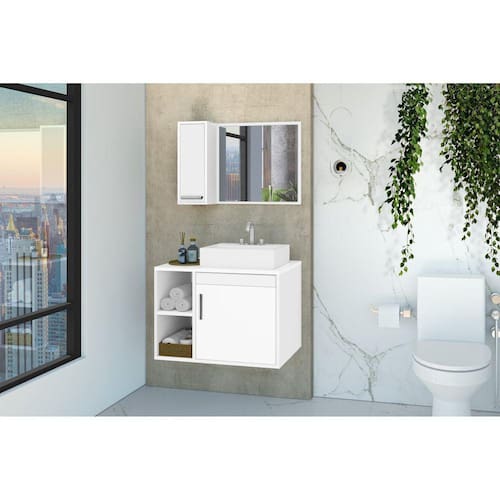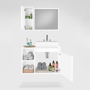 Composto por Espelheira com armário com porta e prateleira interna e espelho, e Gabinete com duas portas e cuba de sobrepor inclusa.