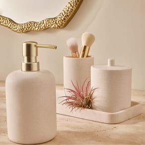 • Dimensões: Porta Sabonete Líquido Ø 9x18cm | Porta Escova Ø 7,5x12cm | Recipiente para Armazenamento Ø 9x12cm | Suporte 31,5x13x2,5cm