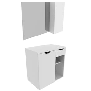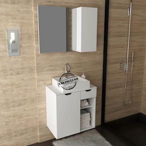 Conjunto Para Banheiro 02 Peças. Com design prático e funcional, estas peças ao ambiente toques de modernidade e elegância. Possuem estruta em MDP de 15mm, e acabamento em pintura UV/BP. Composto por espelheira com 01 porta na lateral do espelho com dobradiças metálicas e 3 nichos internos, espelho ja fixado no painel, o gabinete conta 01 porta com dobradiças metálicas, 02 nichos e 01 gaveta com corrediças metálicas para tornar sua rotina mais prática, ideal para cuba de apoio (cuba não inclusa). Este conjunto é uma ótima escolha para manter seus produtos de higiene e beleza sempre organizados. Estes produtos chegarão na sua casa separados em 02 volumes.