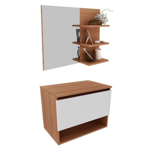 Conjunto Para Banheiro. Com design prático e funcional, estas peças ao ambiente toques de modernidade e elegância. Possuem estruta em MDP de 15mm, e acabamento em pintura UV/BP. Gabinete possui 01 porta basculante com dobradiças metálicas e articulador com trava, 01 nicho, espelheira com 03 prateleiras para tornar sua rotina mais pratica, espelho ja fixado no painel, gabinete suspenso ideal para cuba de apoio (cuba não inclusa). Este conjunto é uma ótima escolha para manter seus produtos de higiene e beleza sempre organizados. Estes produtos chegarão na sua casa separados em 02 volumes.