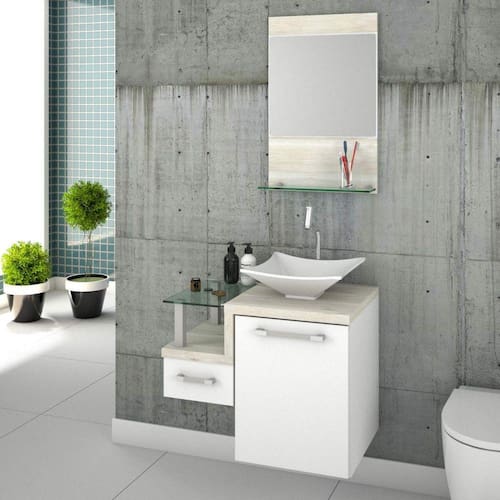 O Kit Legno 631 é um produto compacto, de design contemporâneo e minimalista, projetado para se encaixar no seu espaço, composto por um gabinete com cuba de apoio, gaveta lateral e tampo de apoio de vidro 10mm. A espelheira possui espelho lapidado e 1 prateleira de vidro 10mm, sendo perfeito para organizar suas coisas e fazer parte da decoração do seu banheiro. Acabamento da Cuba: Gel Acabamento da Gaveta: Pintura UV Acabamento da Porta: Pintura UV Acabamento da Prateleira: Vidro Acompanha Cuba: Sim Acompanha Tampo: Sim codigo_ean: 7893640049606 Complexidade da Montagem: Média: pode ser montado por mais de uma pessoa e/ou necessite de maior conhecimento para montagem Cor: Branco/Snow Cor da Cuba: Branco Cor Interna: Branco Escala de Brilho: Fosco Escala de Brilho da Gaveta: Brilhante Escala de Brilho da Porta: Brilhante Escala de Brilho da Prateleira: Brilhante Espessura do Espelho: 3 mm Formato do Espelho: Retangular Furação para Cuba e Torneira: Não Gaveta com Chave: Não Itens Inclusos: 1 Gabinete, 1 Cuba, 1 Espelheira e Manual de Instruções. Linha ou Coleção: Legno Manual de Montagem e Instalação: https://product-hub-prd.madeiramadeira.com.br/510878/documents/2636b7bc-9c32-4675-99df-e599dba6ffb573d386379kitlegno630manual.pdf Material da Cuba: Mármore Sintético Material da Gaveta: MDF/MDP Material da Porta: MDF/MDP Material da Prateleira: Vidro Material do Tampo: MDF/MDP Material Principal: MDF/MDP Medida da Cuba (C x L x P): 34,5cm x 34,5cm x 11,5cm Medida do Gabinete (A x L x P): 51cm x 65cm x 43cm Necessita Montagem: Sim Origem do Produto: Nacional Peso: 25,8 kg Peso Máximo por Gaveta: 2 kg Peso Máximo por Prateleira: 3 kg Possui Espelheira: Sim Possui Gabinete: Sim Possui Gavetas: Sim Possui iluminação: Não Possui Pés: Suspenso Possui Portas: Sim Possui Rodízio: Não Produto Montado: Sim Recomendações de Uso, Manutenção e Limpeza: Para a limpeza, utilize flanela seca ou pano macio levemente umedecido em água. Utilize um pano seco em seguida. Evite contato com produtos químicos (solventes, thinner, acetona, etc.) e não utilize nenhum tipo de esponja de aço. Sistema de Montagem: Parafusos e Buchas Tamanho do Espelho (A x L): 40cm x 37cm Tipo de Corrediça da Gaveta: Metálica Telescópica Tipo de Dobradiça/Corrediça da Porta: Metálica Tipo de Porta: Bater Tipo de Puxador da Gaveta: Externo Tipo de Puxador da Porta: Externo