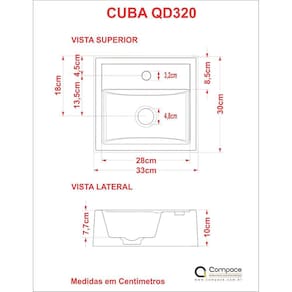 Medida da Cuba (C x L x P): 33cm x 30cm x 10cm